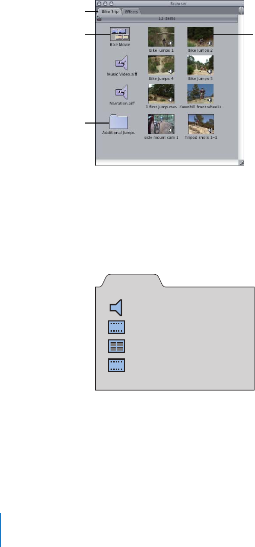 your movie. All of these appear in a project’s tab in the Browser. Although the source